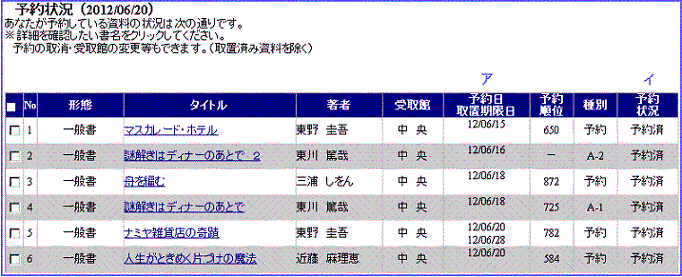 - ■予約日や取置期限日は「ア」の欄にてご確認ください。