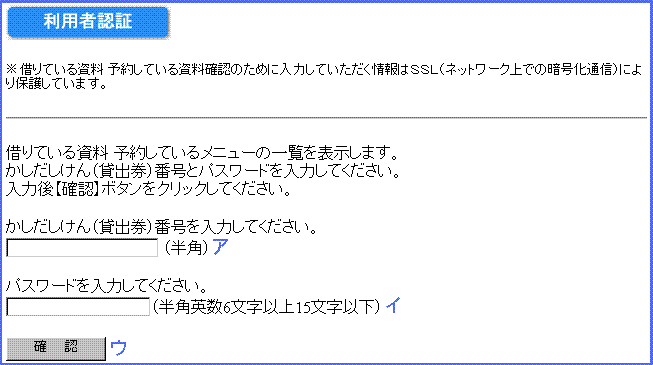 ■貸出券の番号とパスワードの入力が終わりましたら、「ウ」の「認証」をクリックしてください。
